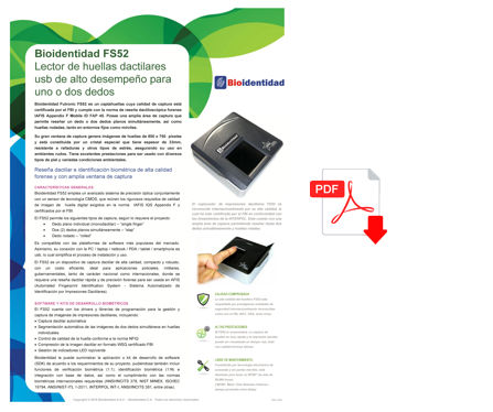 Bioidentidad Futronic FS52 es un captahuellas cuya calidad de captura está certificada por el FBI para aplicaciones de investigación criminal, cumpliendo con las normas de reseña dactilar policial FBI CJIS (Criminal Justice Information Services) IQS (Image Quality Specifications) Appendix F y Mobile ID FAP 45, con una amplia área de captura permitiendo la toma de un dedo o dos dedos planos simultáneamente, así como huellas roladas. Tiene excelentes prestaciones para ser usado con diversos tipos de piel y variadas condiciones ambientales.