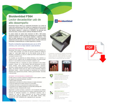 Bioidentidad Futronic FS64 es un captahuellas decadactilar cuya calidad de captura está certificada por el FBI y cumple con la legendaria norma de reseña dactiloscópica forense IAFIS Live Scan (Tenprint) Systems & Identification Flats Systems Appendix F, avalada por la INTERPOL, para la captura de las diez huellas planas y rodadas. Es adecuado para aplicaciones fijas y móviles, también estando certificado FBI Mobile ID FAP 60.